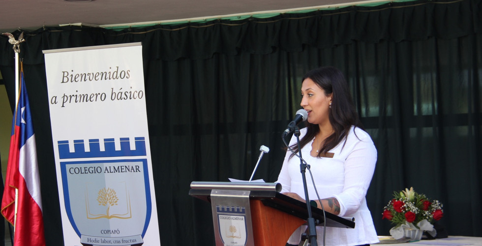 Miss Jessica Bruna, profesora jefe del primero básico, entregando unas palabras de bienvenida a sus estudiantes.